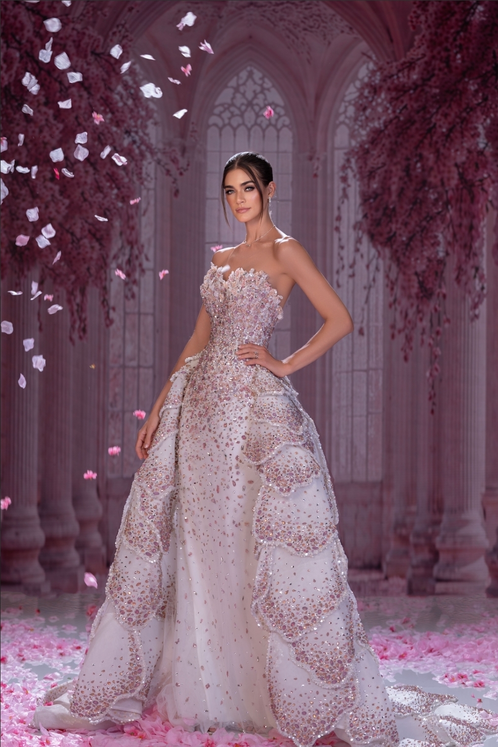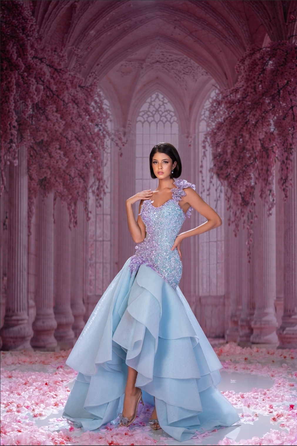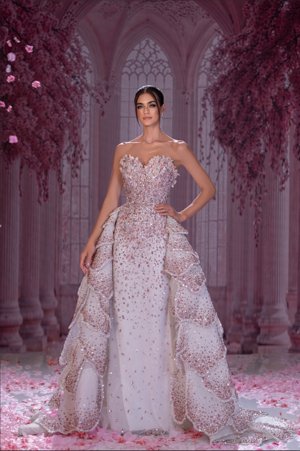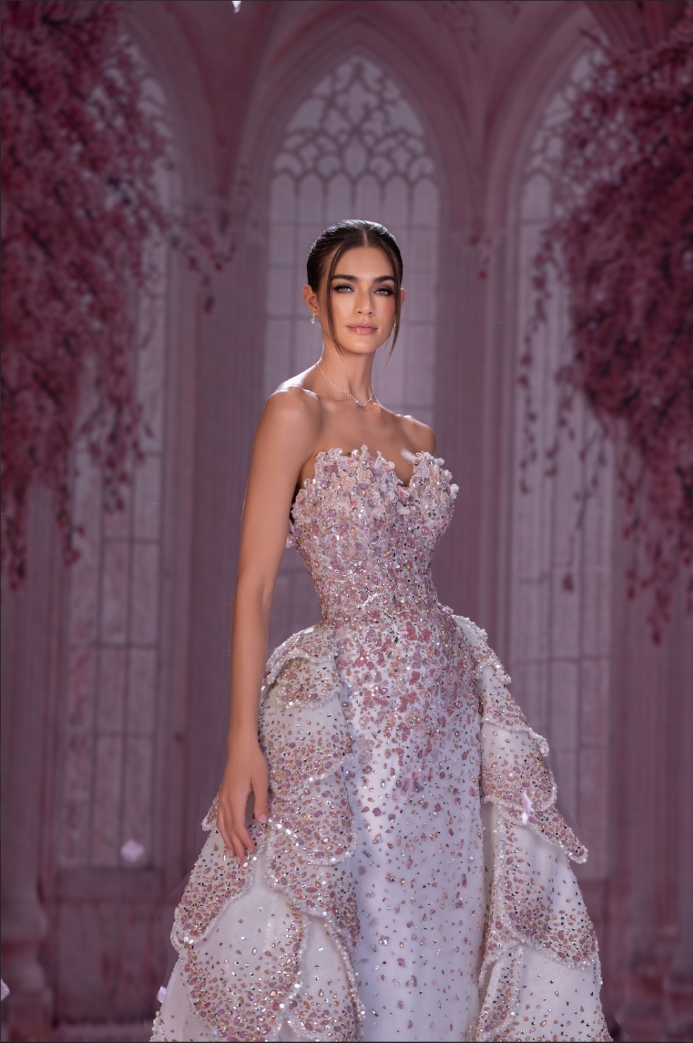 المجموعة التي ضمّت 27 تصميماً فاخراً تنوّعت بين فساتين السهرة والأعراس، جسّدت فلسفة أن الجمال الحقيقي لا يخضع لمواسم، بل يخلق موسمه الخاص. وفي خروجٍ أنيق عن التقاليد اللونية لموسم الشتاء، مزجت التصاميم بين الليلكي والنيلي والزهري الفاتح مع تدرجاته، بأقمشة نابضة بالضوء، وزخارف يدوية تحمل لمسات الهوت كوتور الفاخرة، وكأن كل فستان هو قصيدة تُكتَب بالخيط والإبرة.